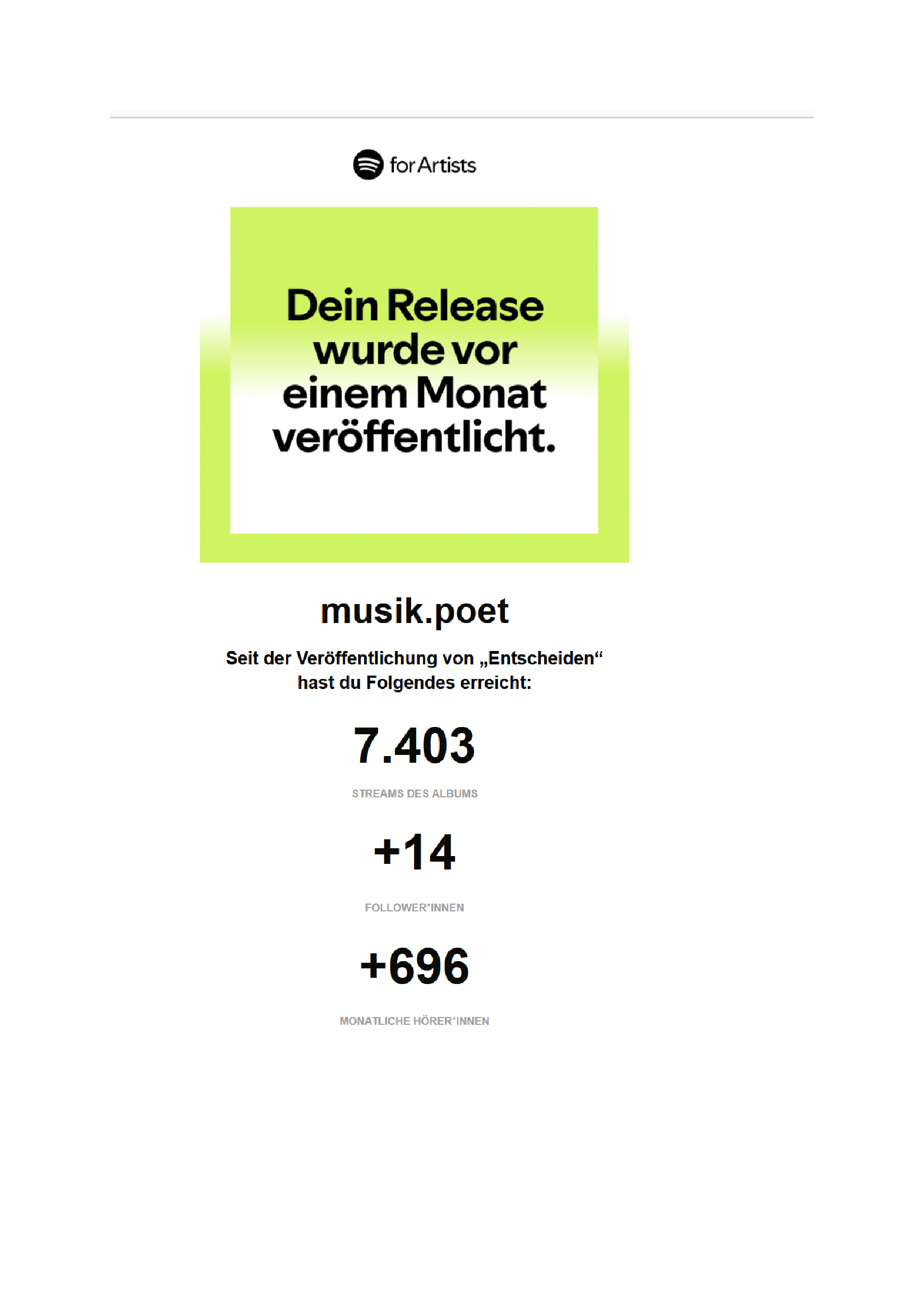 Mit meinem aktuellen Song „Entscheiden“ ,neuestes Musikrelease, feiere ich einen großartigen Meilenstein: In nur einem Monat hat dieser Musikrelease über 7.400 Spotify-Streams erreicht – und die Anzahl der monatlichen Hörer*innen ist zusätzlich um 700 gestiegen. Für mich als Singer-Songwriter zählt nicht nur die Zahl, sondern vor allem, dass meine Musik und ihre Botschaft euch erreicht. Jeder einzelne Stream, jedes Teilen und jedes Feedback sind für mich als Künstler kostbar und bedeuten echte Anerkennung.